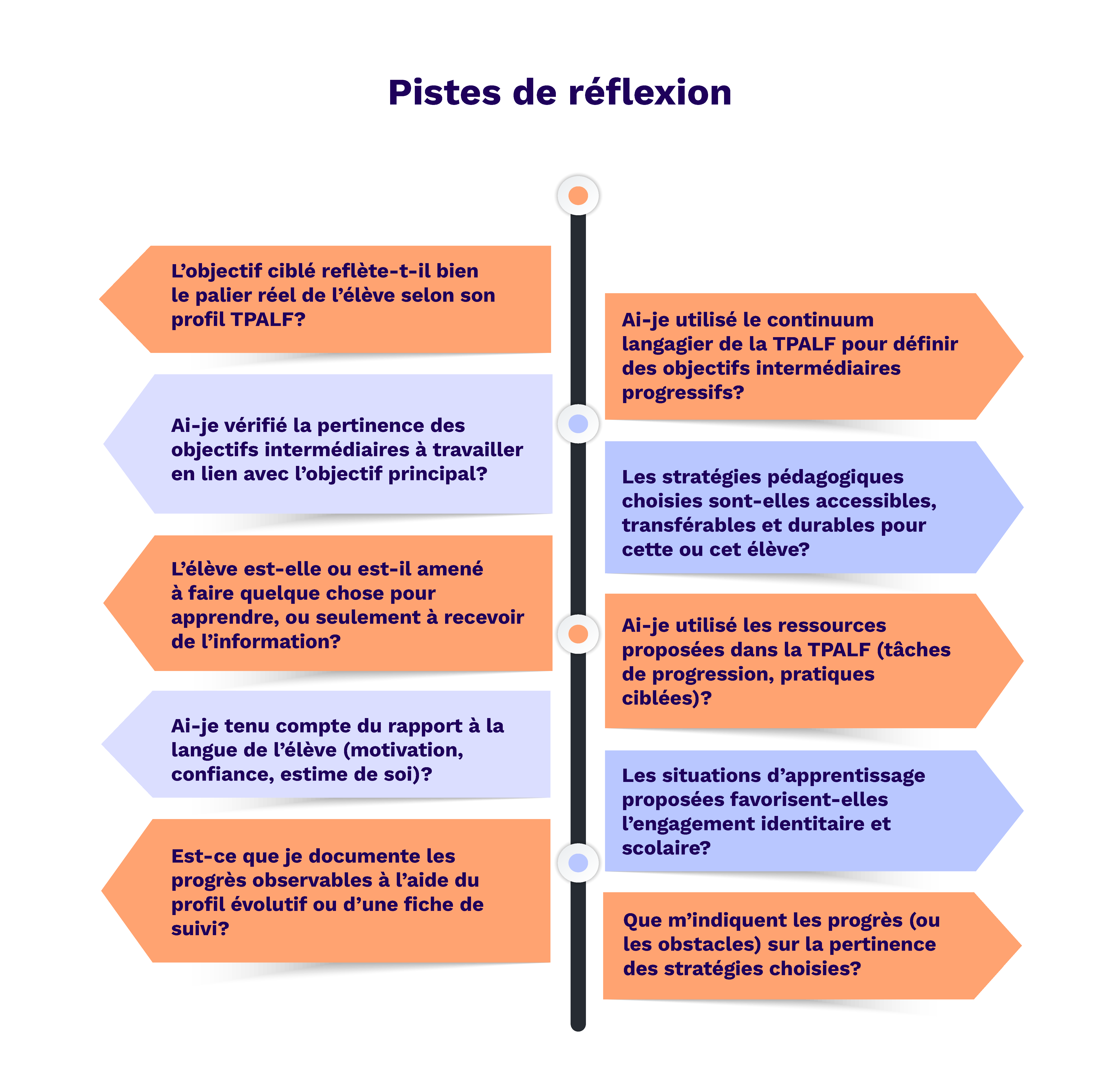 Tenir compte de ces éléments dès la planification lève des freins invisibles à l’apprentissage et pose des gestes pédagogiques favorisant l’engagement, l’estime de soi ainsi que la valorisation identitaire. Cela renforce également les choix stratégiques faits lors de la mise en œuvre du plan d’appui temporaire en assurant un appui humain et adapté non seulement au profil d’apprentissage actuel, mais aussi au vécu langagier de l’élève.