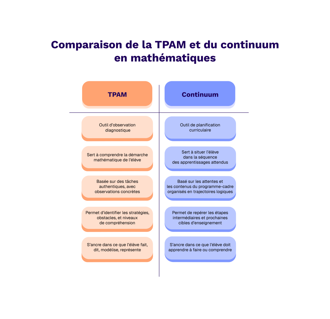 La TPAM sert à recueillir des données riches sur les acquis, les démarches, les stratégies et les obstacles conceptuels propres à chaque élève à travers des tâches authentiques ancrées dans les cinq domaines du programme-cadre. Le continuum, quant à lui, fournit un cadre curriculaire structuré qui décrit la séquence logique des apprentissages et les habiletés transitoires nécessaires pour cheminer vers une compréhension approfondie et transférable des mathématiques. L’utilisation conjointe de ces deux documents aide :