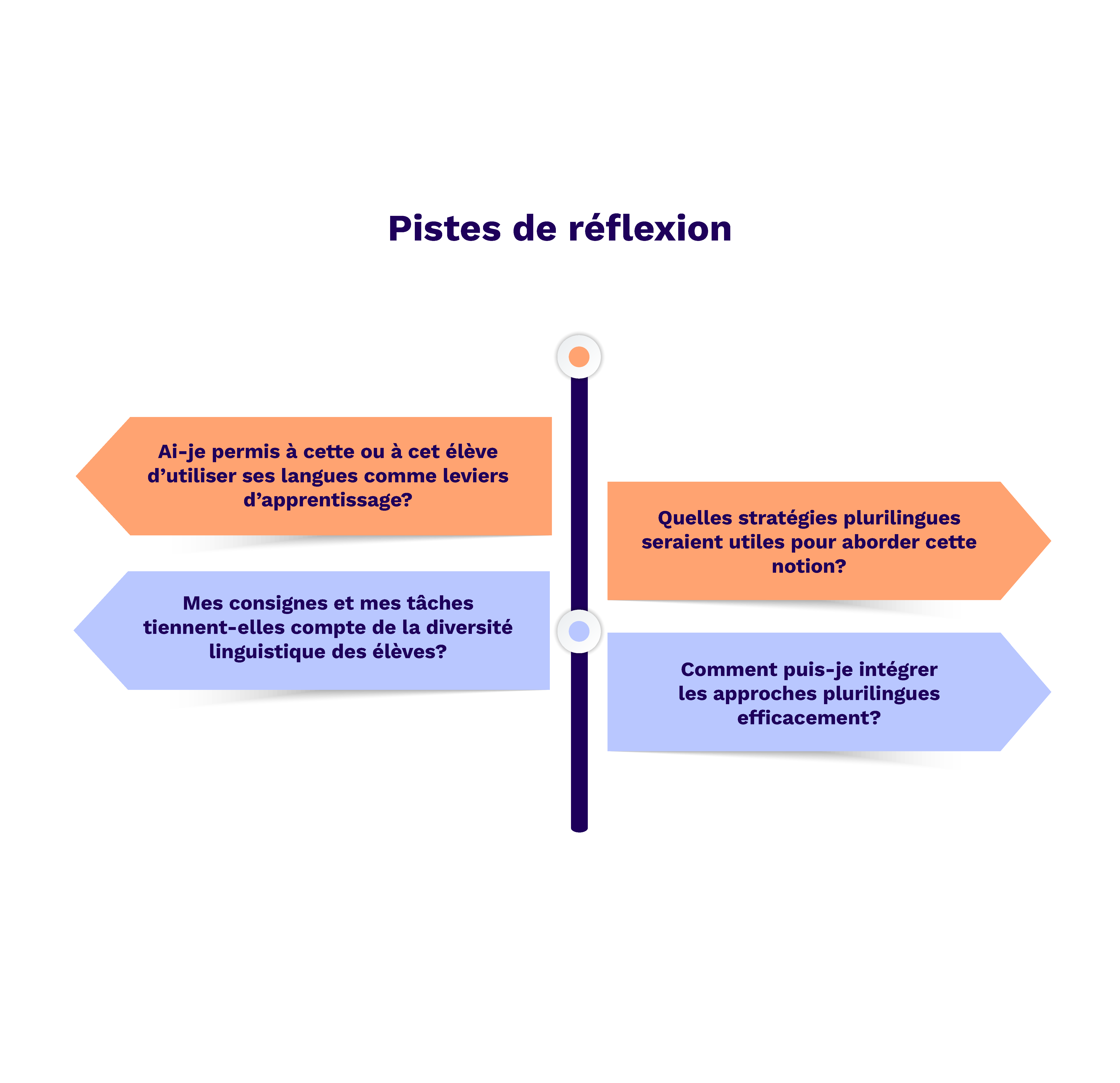 Les approches plurilingues permettent aux ÉP apprenants du français, aux ÉNA et aux ÉNA-ÉP en apprentissage du français de mobiliser l’ensemble de leur répertoire linguistique pour apprendre, comprendre et communiquer. Elles transforment les langues parlées et comprises en leviers d’apprentissage, valorisent les identités linguistiques et culturelles, et renforcent le sentiment de compétence dès les premières interactions scolaires. En salle de classe, elles deviennent un outil structurant au service d’une planification différenciée, inclusive et ancrée dans les réalités linguistiques des ÉP apprenants du français, des ÉNA et des ÉNA-ÉP en apprentissage du français.