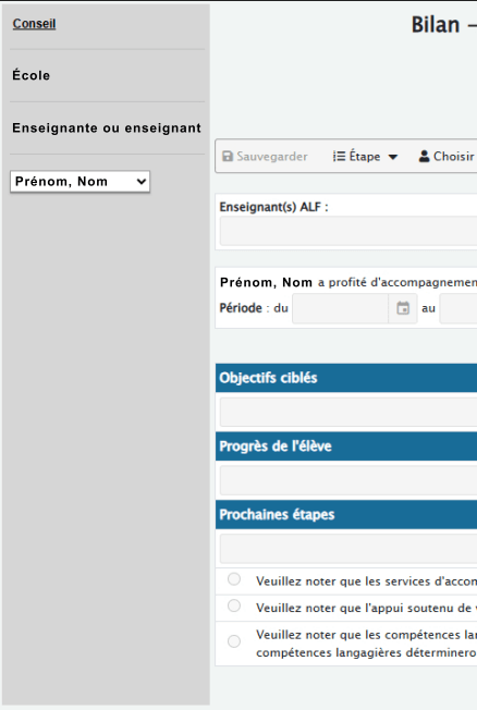 L’accueil des élèves plurilingues apprenants du français, des élèves nouveaux arrivants et des élèves nouveaux arrivants qui sont à la fois plurilingues et en apprentissage du français nécessite une évaluation de leurs points forts et de leurs besoins en vue de planifier leur cheminement scolaire et d’élaborer, au besoin, un plan d’appui temporaire. Approfondissez votre réflexion sur les éléments clés de l’évaluation des acquis dans l’activité Dresser le profil d’apprentissage. Explorez les étapes à franchir, de l’évaluation diagnostique à l’élaboration d’un plan d’appui temporaire, dans la page Élaboration d’un plan d’appui temporaire. Finalement, consultez un Exemple de gabarit de fiche de données de l’élève et un Exemple de gabarit d’un plan d’appui temporaire pour soutenir l’accueil et l’appui des élèves plurilingues apprenants du français, des élèves nouveaux arrivants et des élèves nouveaux arrivants qui sont à la fois plurilingues et en apprentissage du français. Téléchargez une copie des documents, ou imprimez-les. Une bonne pratique consiste à les consulter régulièrement pour soutenir une démarche réflexive continue dans l’accueil.