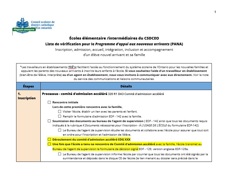Consultez cette liste de vérification, élaborée par le Conseil scolaire de district catholique de l’Est ontarien, qui constitue un exemple de liste de vérification pour les différentes étapes allant de l’inscription à l’accompagnement d’un élève nouvel arrivant et de sa famille.