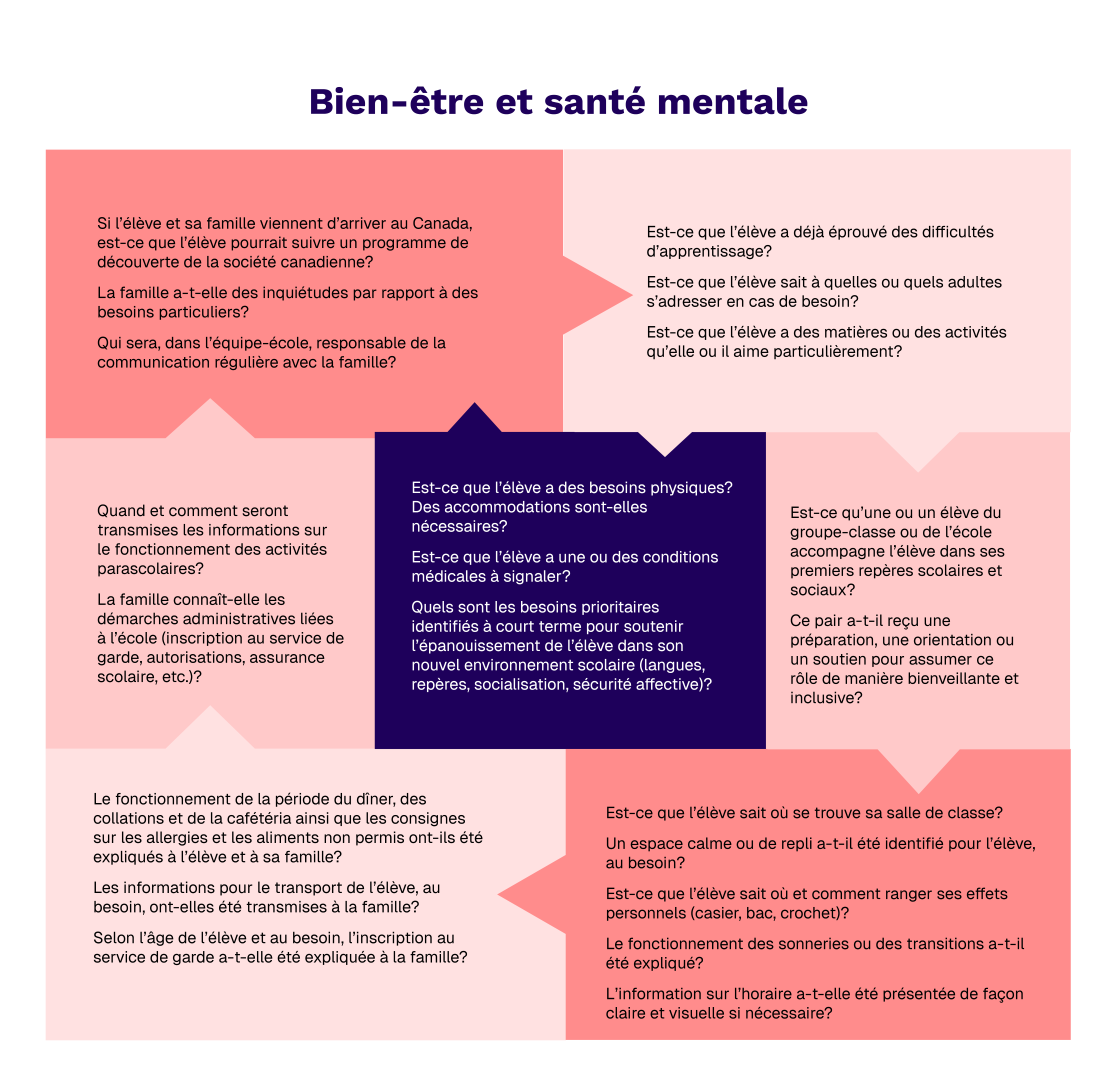 Cependant, il est tout aussi important de tenir compte du bien-être global de l’élève ainsi que de son répertoire linguistique et culturel, et qu’elle ou il fasse l’objet d’un suivi régulier pour assurer un accompagnement continu.