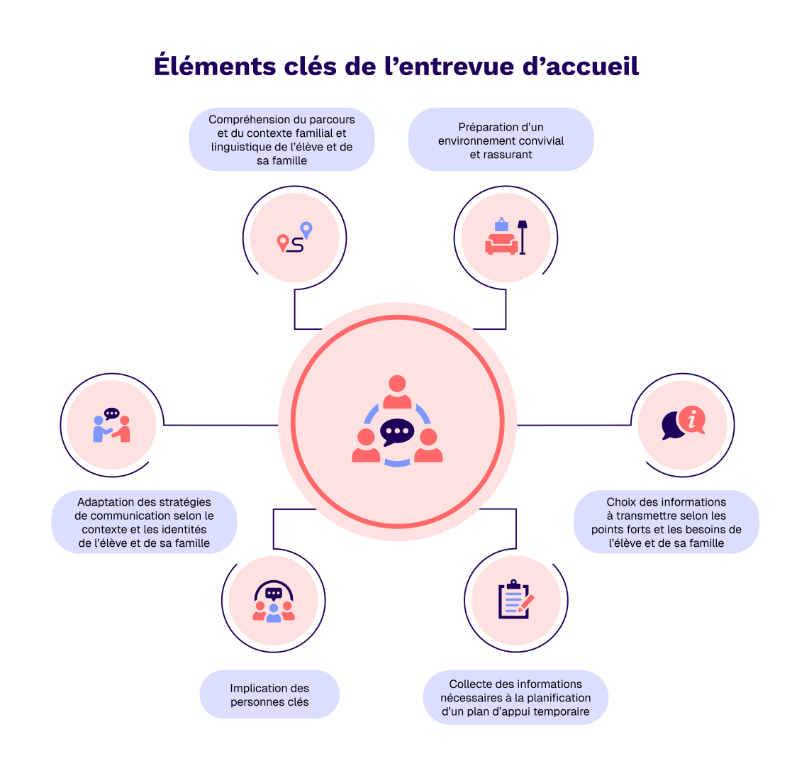 L’entrevue d’accueil sert à mieux connaître le parcours des ÉP apprenants du français, des ÉNA et des ÉNA-ÉP en apprentissage du français ainsi qu’à repérer leurs points forts ainsi que leurs besoins scolaires, langagiers, socioaffectifs et logistiques dans le but de planifier des interventions en conséquence. On tend à vouloir donner la priorité aux besoins scolaires des élèves, tels que :