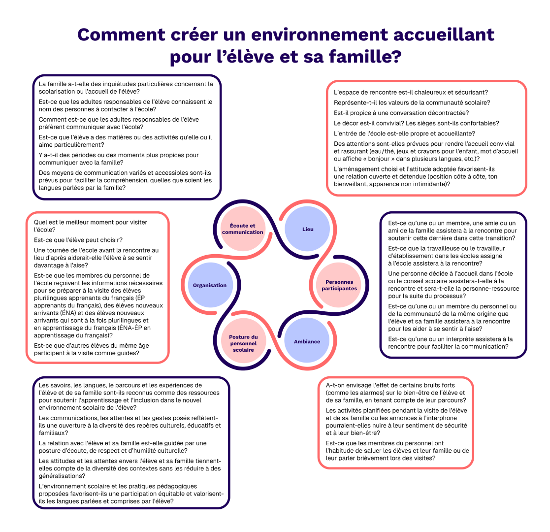 En somme, un accueil bien pensé et structuré peut grandement contribuer à une adaptation et à une inclusion harmonieuses ainsi qu’à une expérience scolaire positive pour les élèves. Un accueil global et complet des ÉP apprenants du français, des ÉNA et des ÉNA-ÉP en apprentissage du français demande de la planification et des ajustements constants pour répondre aux spécificités de chaque personne et pour offrir une transition et une inclusion équitables et bienveillantes, autant pour l’élève que pour sa famille. Réfléchir aux éléments clés, aux rôles de chaque personne et aux étapes du processus d’accueil est en soi la toute première et la plus importante étape pour accueillir ces élèves dans la communauté scolaire. Cela mènera, par la suite, à un accompagnement solide et étoffé.
