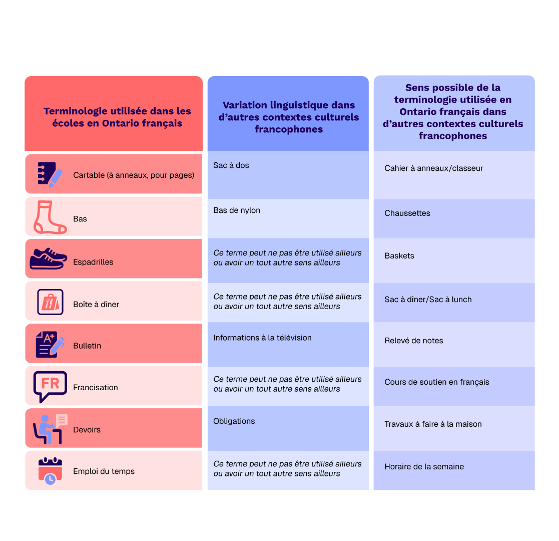 Les mots ne signifient pas toujours la même chose d’un espace francophone à un autre. Certains termes couramment utilisés dans les écoles de langue française de l’Ontario peuvent être moins familiers ou avoir un sens différent dans d’autres contextes culturels. Ainsi, est-ce que je porte attention à ces variations lorsque je m’adresse à l’élève et à sa famille? Ai-je besoin d’expliquer ou d’utiliser d’autres formulations pour assurer une bonne compréhension? Voici quelques exemples de termes dont le sens peut varier selon les contextes.