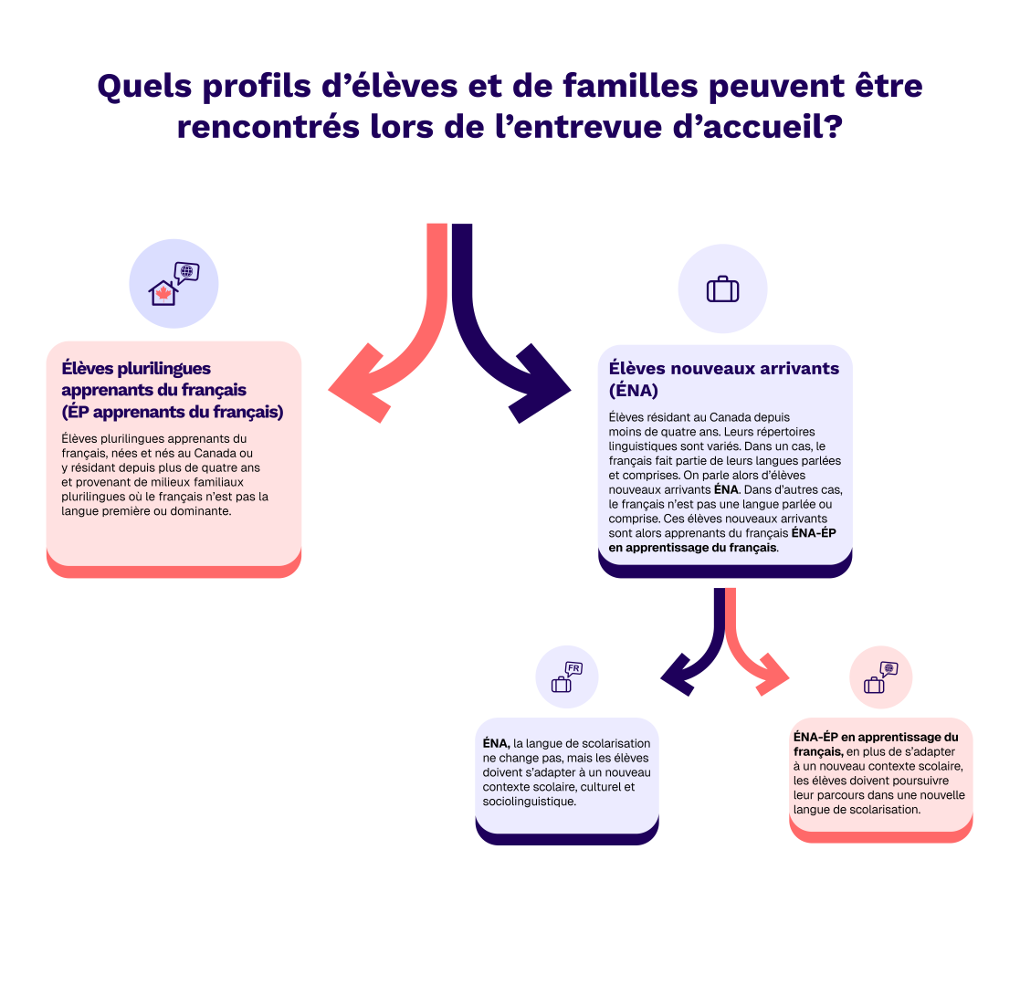 Les écoles de langue française accueillent des élèves aux profils variés. Certaines d’entre elles et certains d’entre eux ont le français comme langue première ou dominante et ne parlent pas d’autres langues. D’autres sont plurilingues, ayant soit le français comme langue dominante parmi d’autres, soit une ou plusieurs autres langues premières ou dominantes dans leur répertoire linguistique. Par ailleurs, les élèves qui résident au Canada depuis moins de quatre ans sont considérées et considérés comme des élèves nouveaux arrivants.